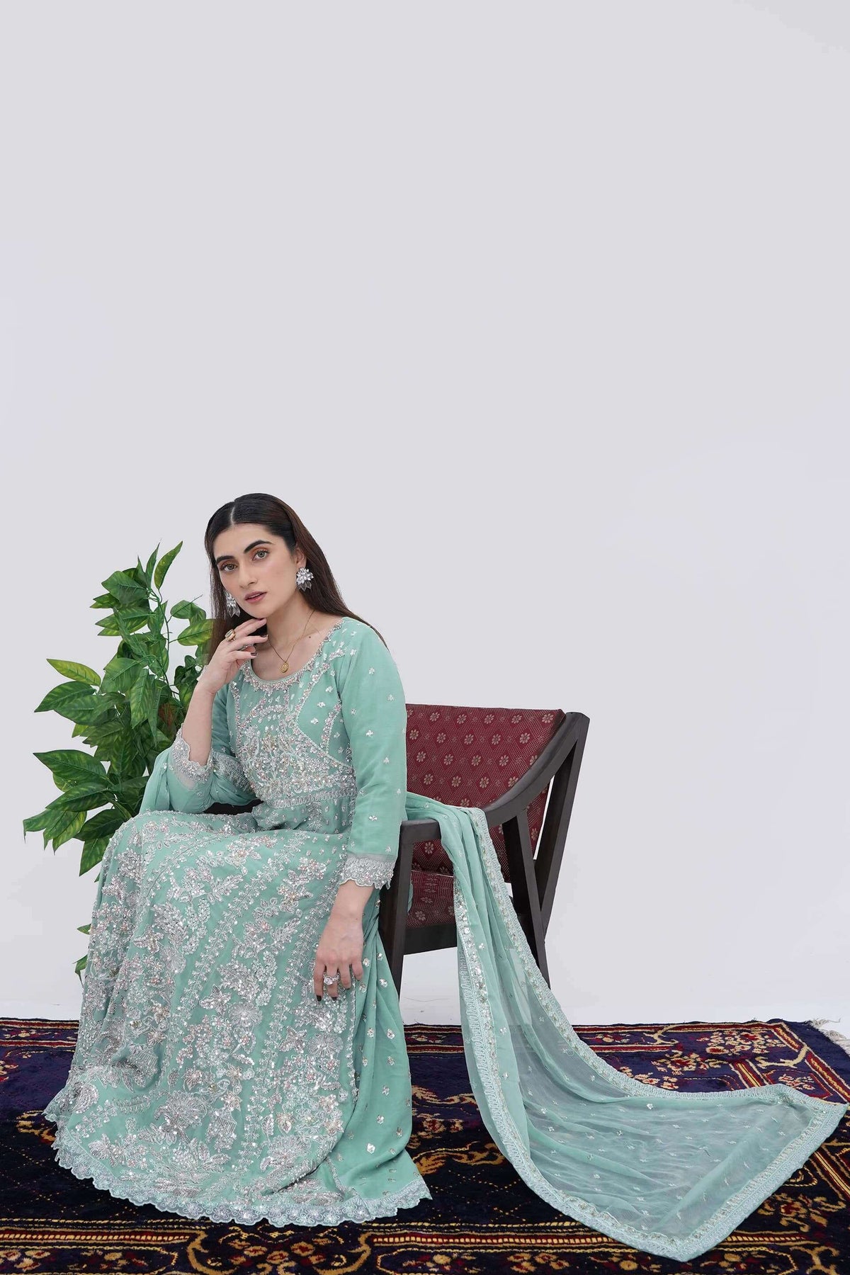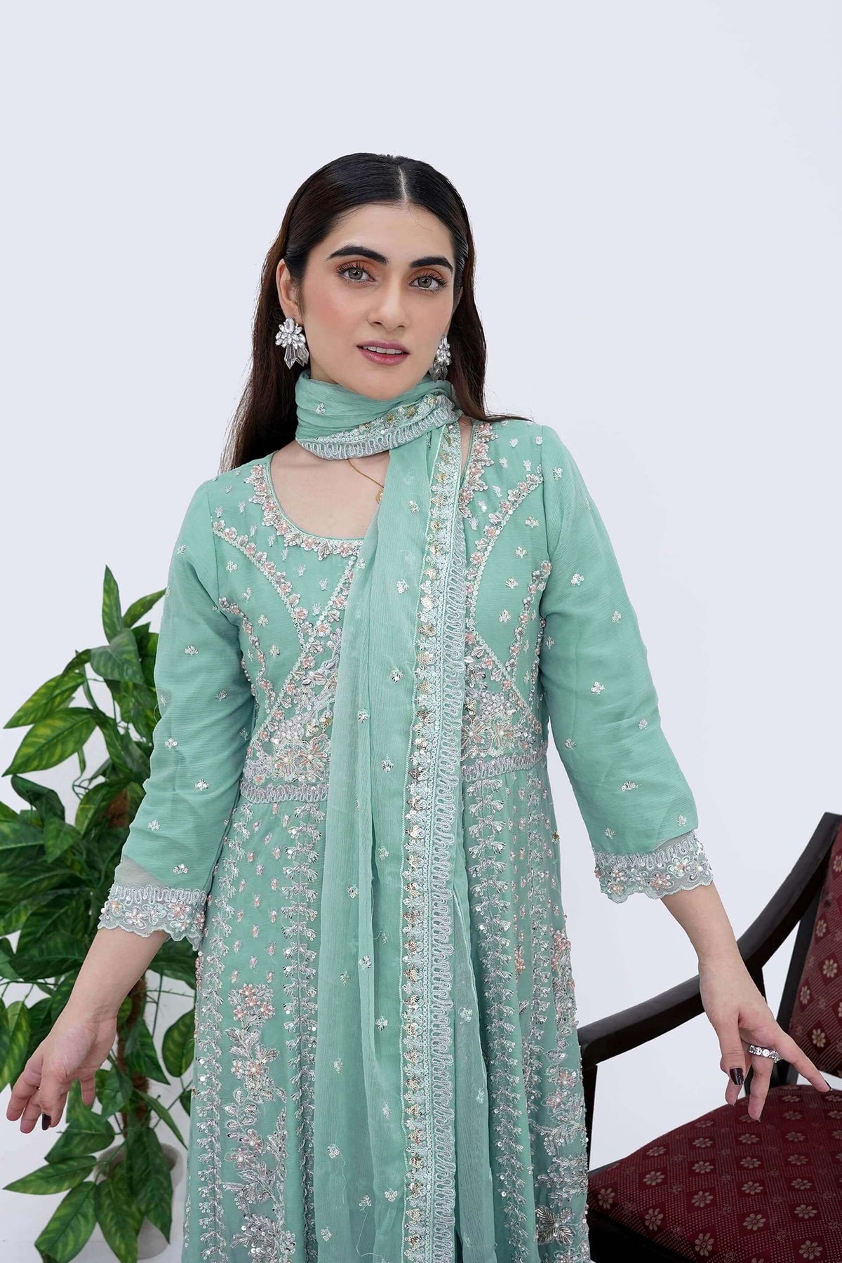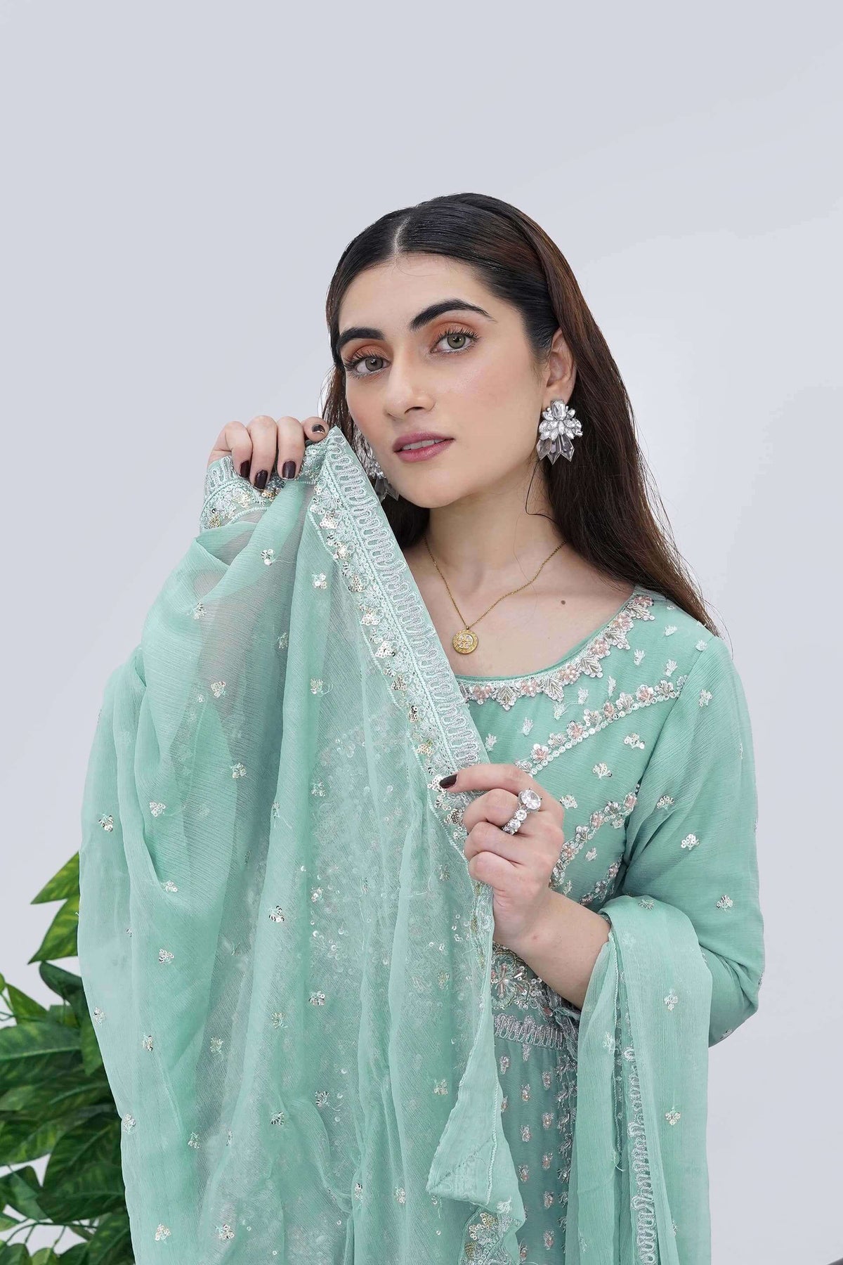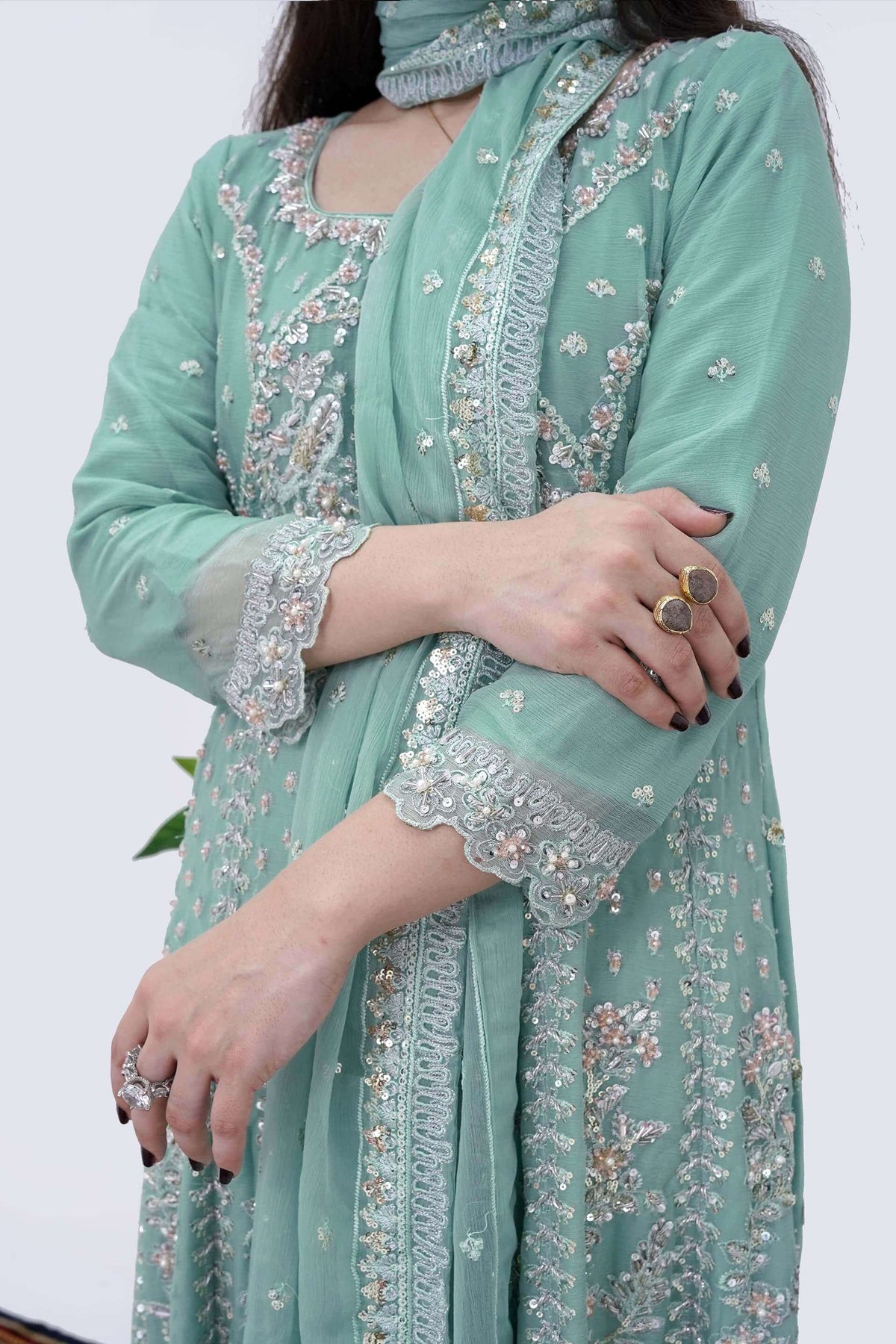A luxury mint cream chiffon maxi dress crafted with intricate handwork. Perfect for female designer clothes enthusiasts, this piece combines elegance and comfort. A versatile gown for upscale parties, weddings, and formal events, it’s part of our womens designer outfits collection. Comes with a matching dupatta.