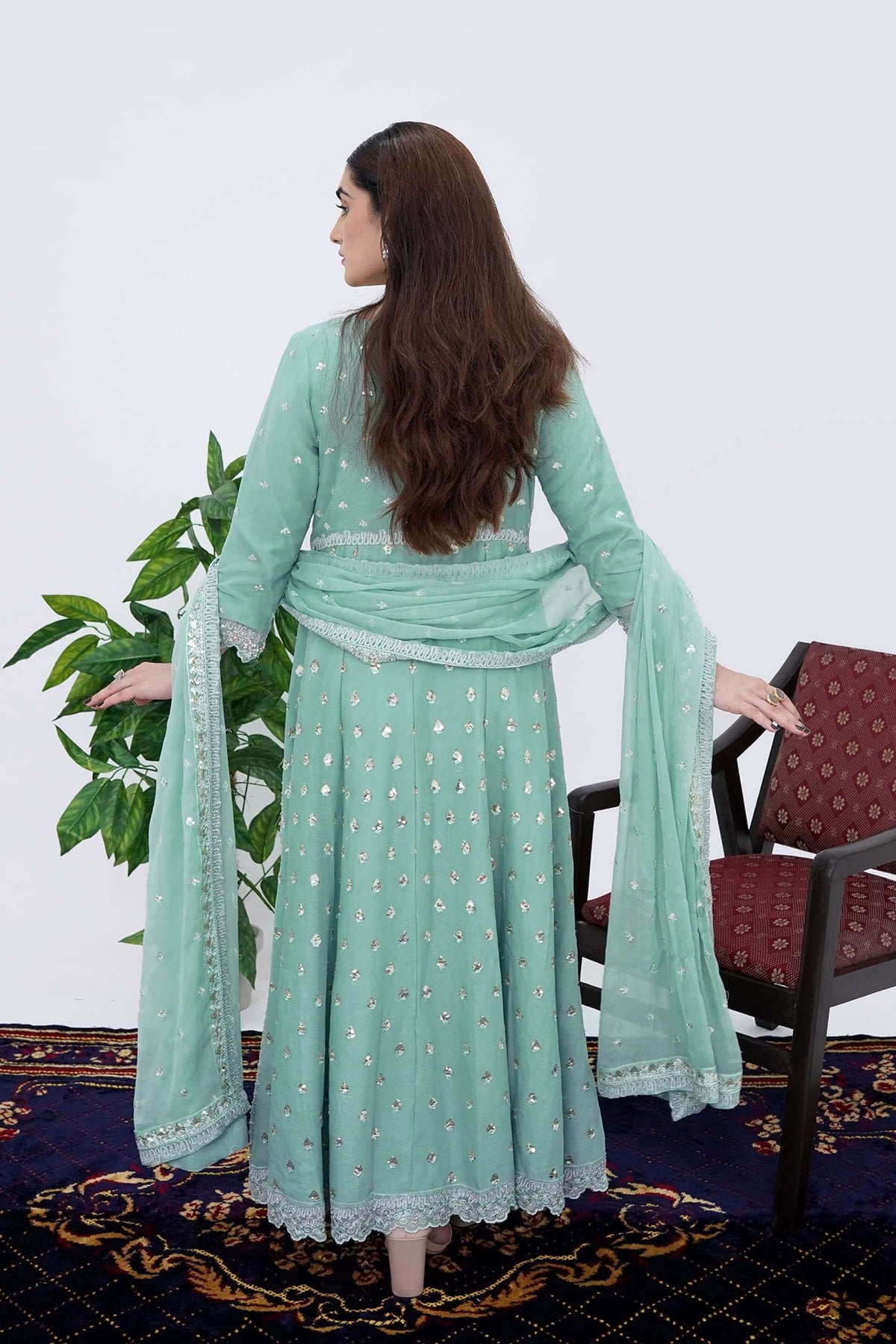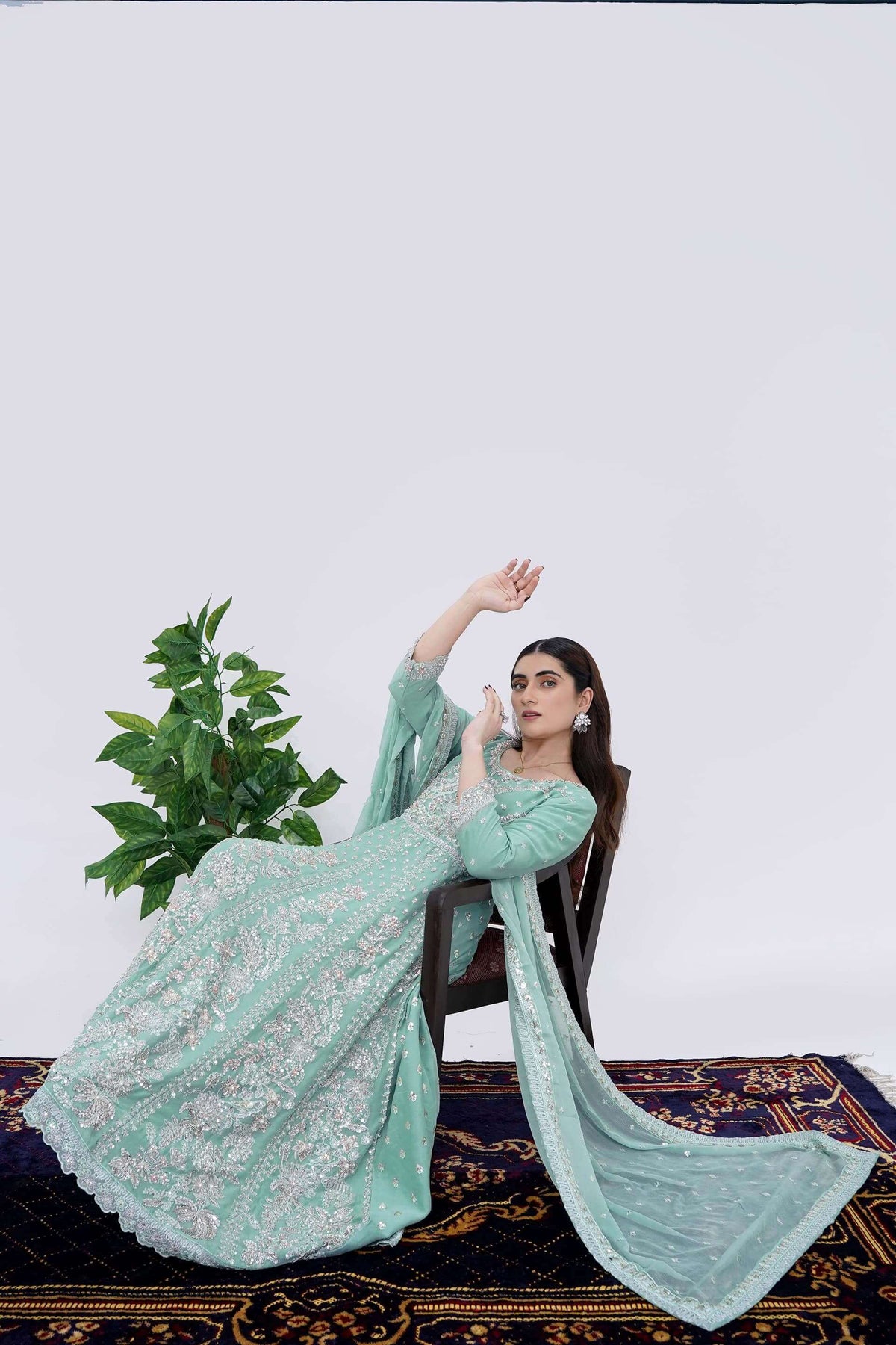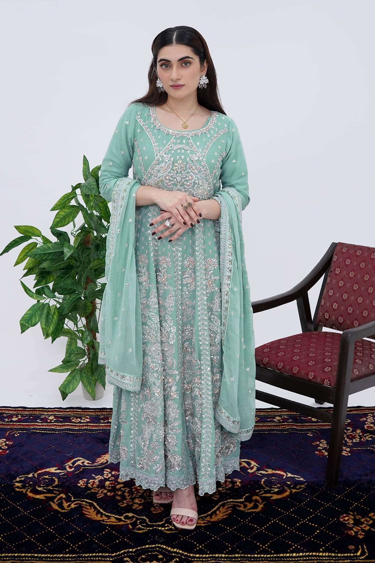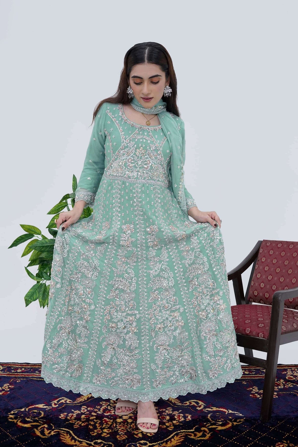 A luxury mint cream chiffon maxi dress crafted with intricate handwork. Perfect for female designer clothes enthusiasts, this piece combines elegance and comfort. A versatile gown for upscale parties, weddings, and formal events, it’s part of our womens designer outfits collection. Comes with a matching dupatta.
